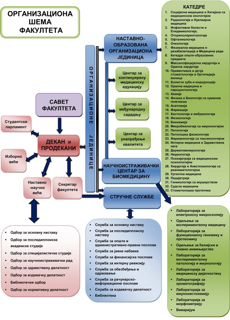 У зависности од врсте послова, међусобне сродности и функционалне повезаности, сви послови на Медицинском факултету обављају се у оквиру организационих јединица и то: